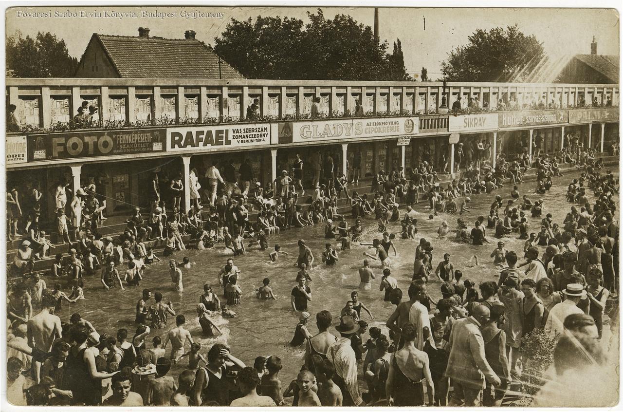 strandfürdő, medence, reklám, felirat, uszoda, fürdőzés, fürdőruha, park, szobor, néptömeg