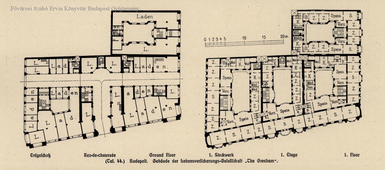 Budapest, Gebäude der Lebensversicherung-Gesellschaft "The Gresham" Erdgeschoss, 1. Stockwerk = Ground floor, 1. floor /