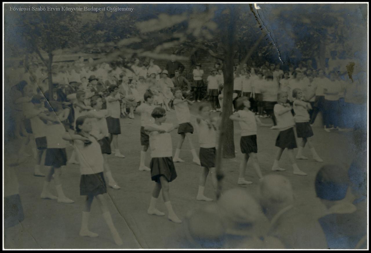 egyházi iskola, református egyház, elemi iskola, udvar, torna, tömeggyakorlat, ünnepség, lány, külső felvétel, 1929