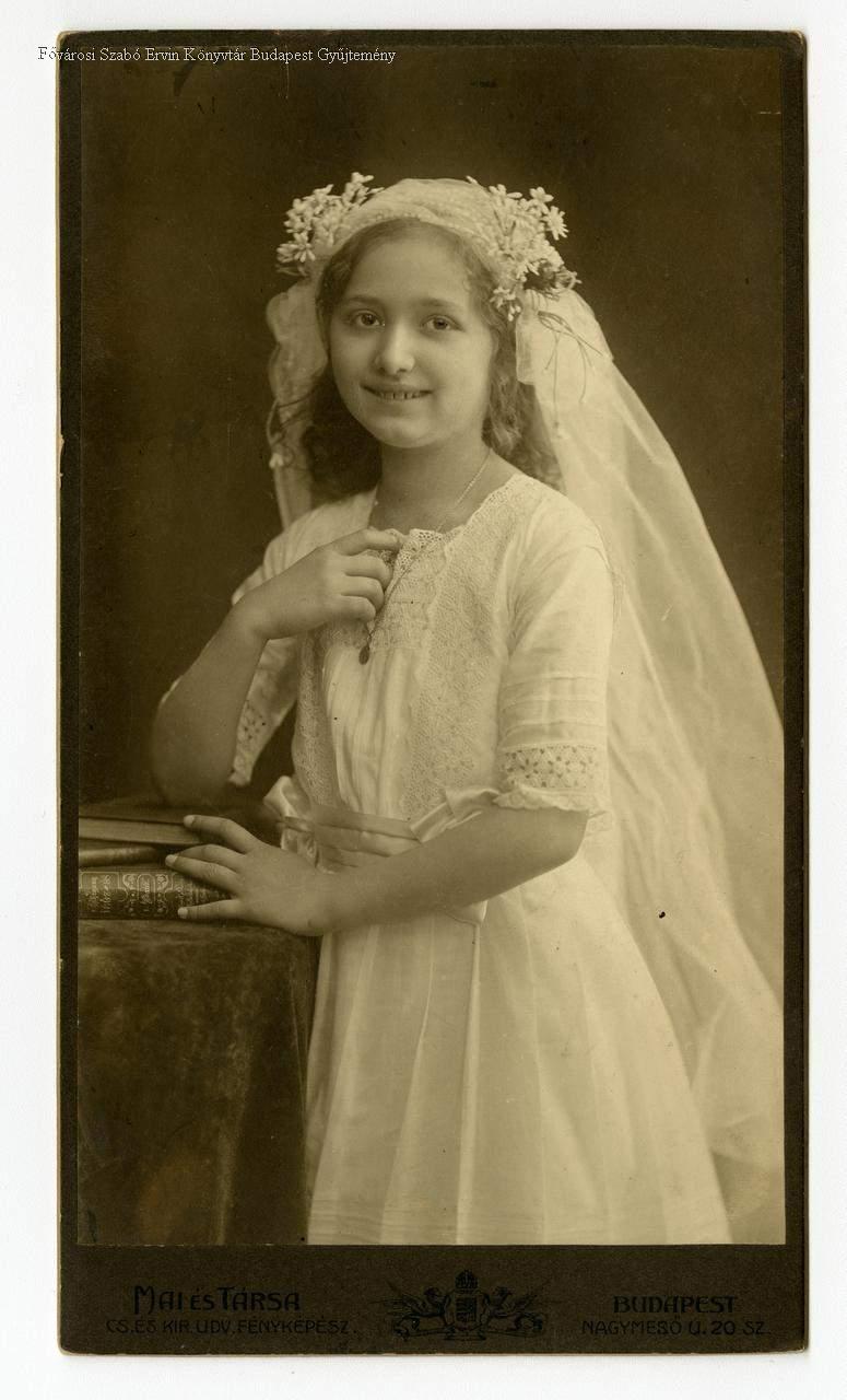 Iskoláskorú lány fehér ruhában, virágdíszes fáyollal a fején; bérmálkozási emlékkép (?)