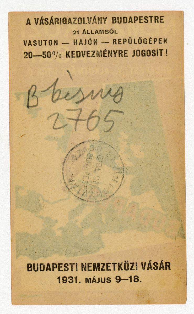 A hirdetés szövege: 1931. május 9 - 18. A vásárigazolvány Budapestre 21 államból vasúton - hajón - repülőgépen 20 - 50 % kedvezményre jogosít!