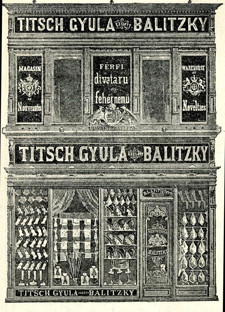 Titsch Gyula, csász. és kir. udvari szállító azelőtt Balitzky Budapest, IV., Váczi-utca 21. A nagy Kistóf mellett