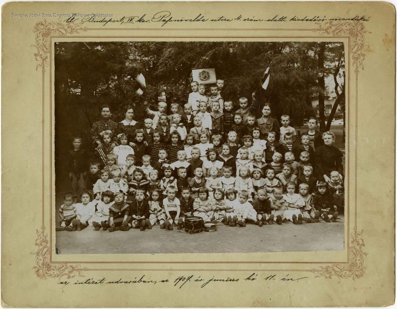 A nyomtatott műtermi kartonon autográf felirat: "A Budapest, IV. ker. Papnövelde utcza 4. szám alatti kisdedóvó növendékei az intézet udvarában, az 1907. év junius hó 11-én".
