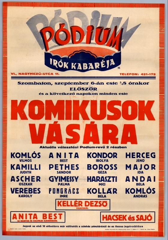 A Pódium Írók Kabaréja: Komikusok vására - Aktuális választási Pódium-revű 2 részben című előadás bemutató plakátja. A helyszínt, a plakáton megadott cím alapján az 1942 és 1944 közötti Vidám Színházhoz lehetne társítani (amely mai Radnóti Miklós Színház előtt működött). A bemutató szombaton, szeptember 6-án volt, majd a következő napokon minden este tartottak előadást. Konferált Kellér Dezső, új magyar és külföldi slágerekkel jelentkezett Anita Best, valamint feltünt Hacsek és Sajó is. A Vidám Színház bezárását követően a Pódium Kabaré vette át a helyét.
