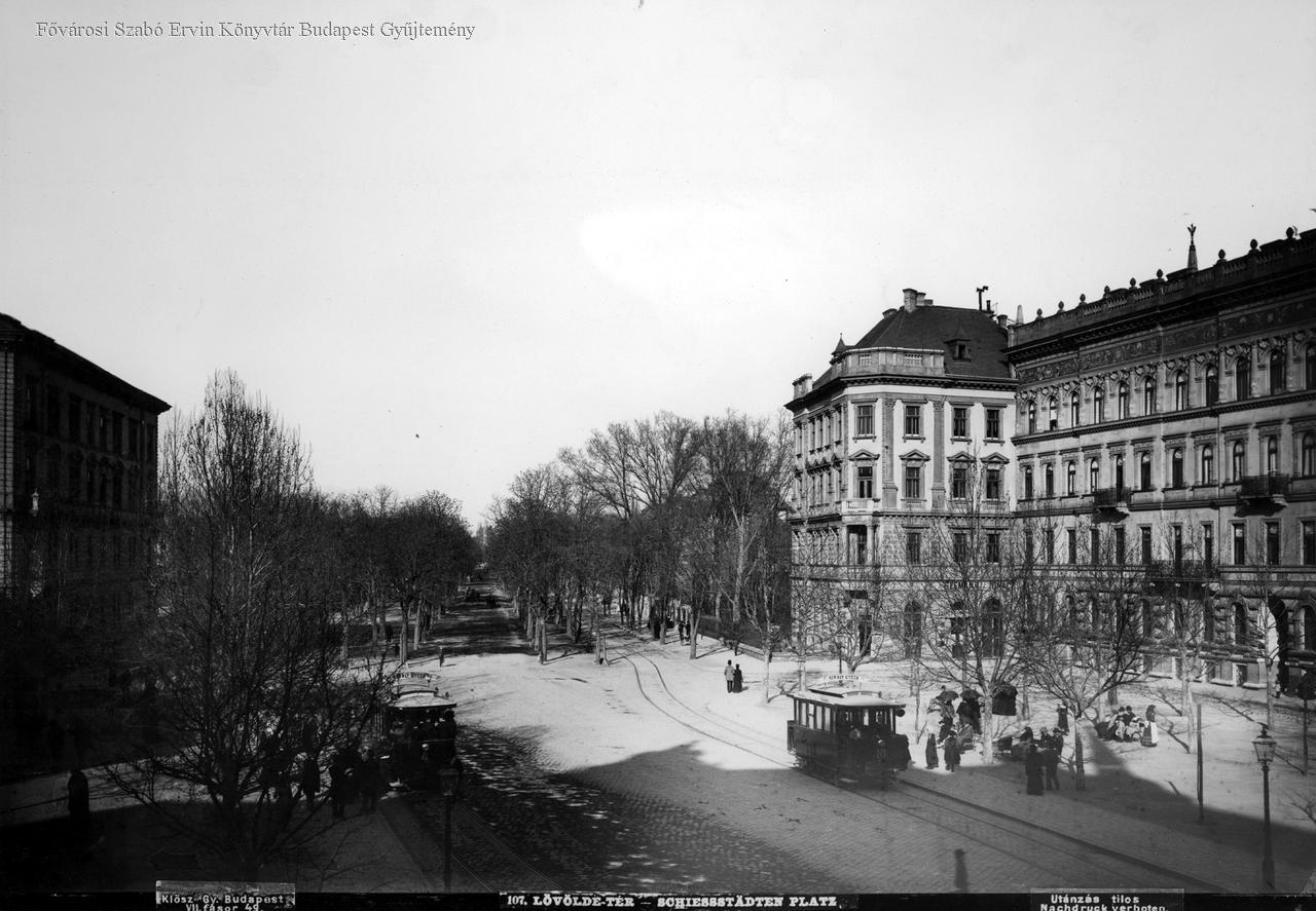 Lövölde tér és a Városligeti fasor. Villamosmegállóban álló szerelvények, várakozó utasok. A fasor végén a Városliget. A térrel a bérházsor véget ér