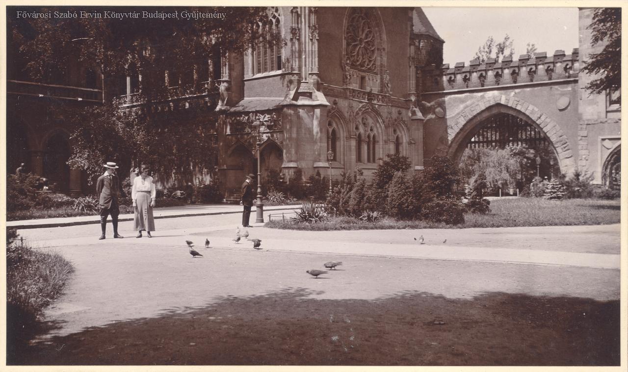 vár, múzeum, ember, udvar, park, növényzet, épületkép, emberpár képe, galamb, külső felvétel, 1910