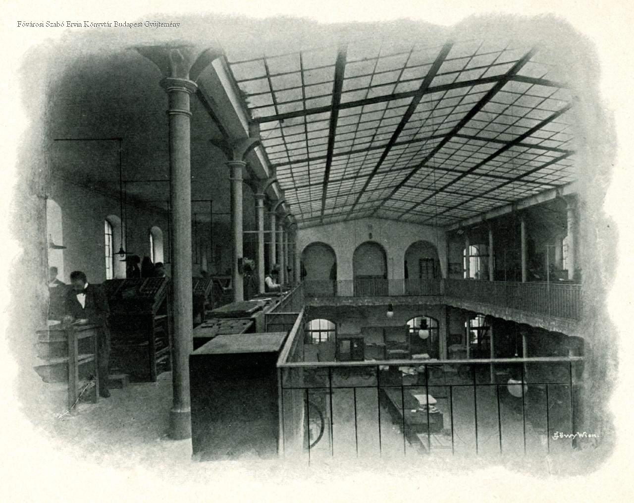 [Hornyánszky Viktor Könyvnyomda nagy szedőterem a gépterem felett]