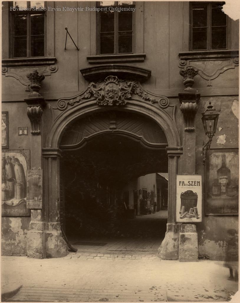 lakóépület, díszítés, kapu, barokk, hirdetés, udvar, cégtábla, tüzelő, épületkép, külső felvétel, 1900 körül