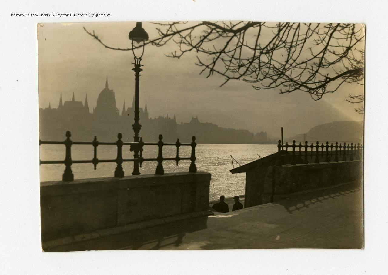 [Dunai látkép az Országház sziluettjével a budai partról]