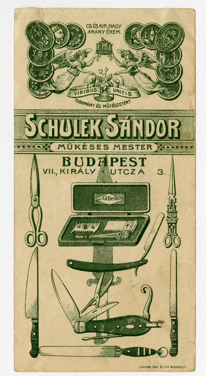 kés, olló, bicska, köszörülés, kitüntetés, címer, üzlet, reklámnyomtatvány, kisnyomtatvány, aprónyomtatvány, számolócédula
