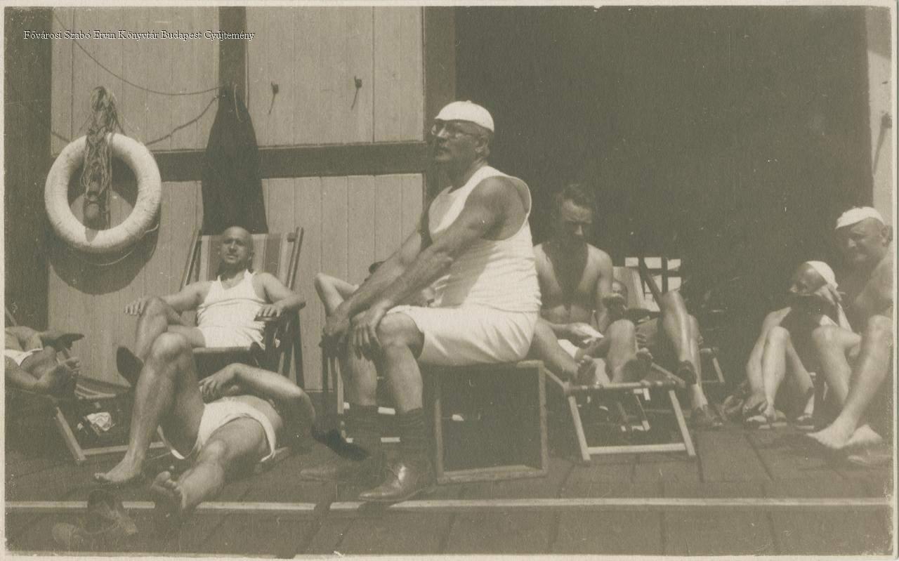 evezősport, csónakház, sportruházat, mentőöv, szabadidő, pihenés, napozás, férfi, 1930-as évek