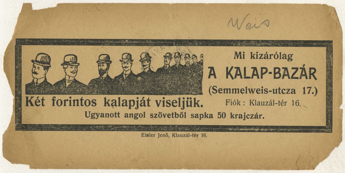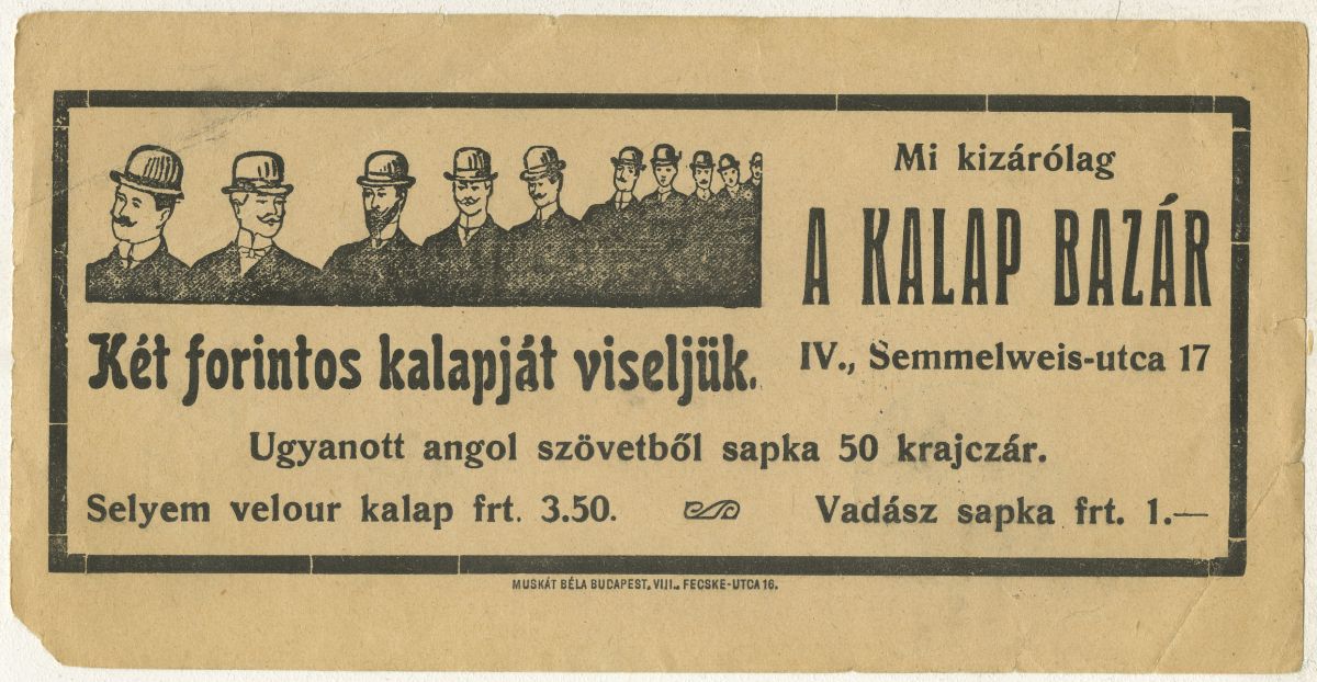 Ugyanott angol szövetből sapka 50 krajcár. Selyem velúr kalap frt. 3.50. Vadász sapka frt. 1.-