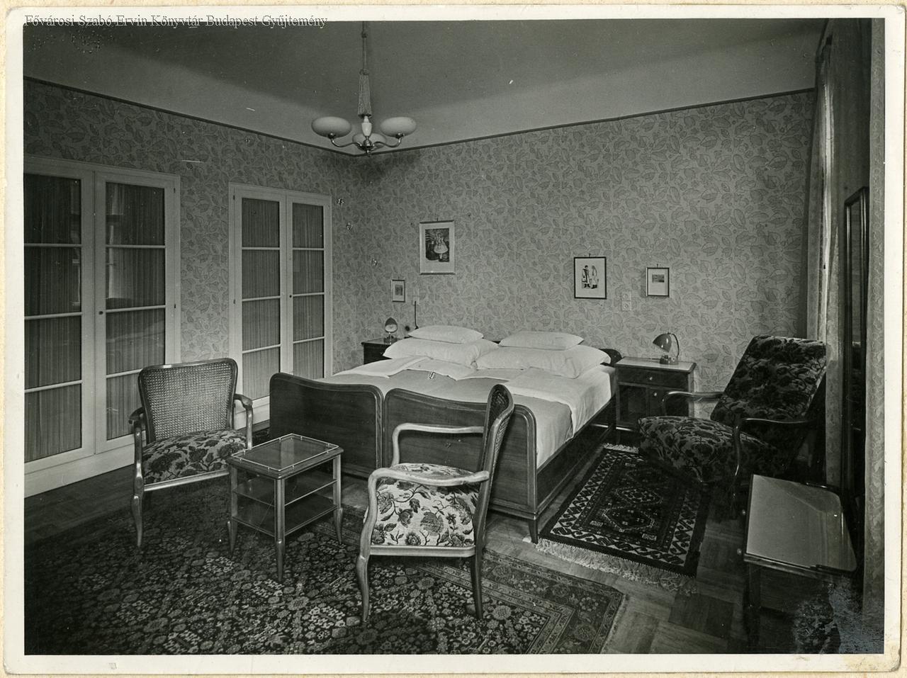 szálloda, hálószoba, szállodaberendezés, ágy, támlásszék, asztal, támlásszék, vendéglátás, asztal, szőnyeg, falidísz, lámpa, lakberendezés, 1937