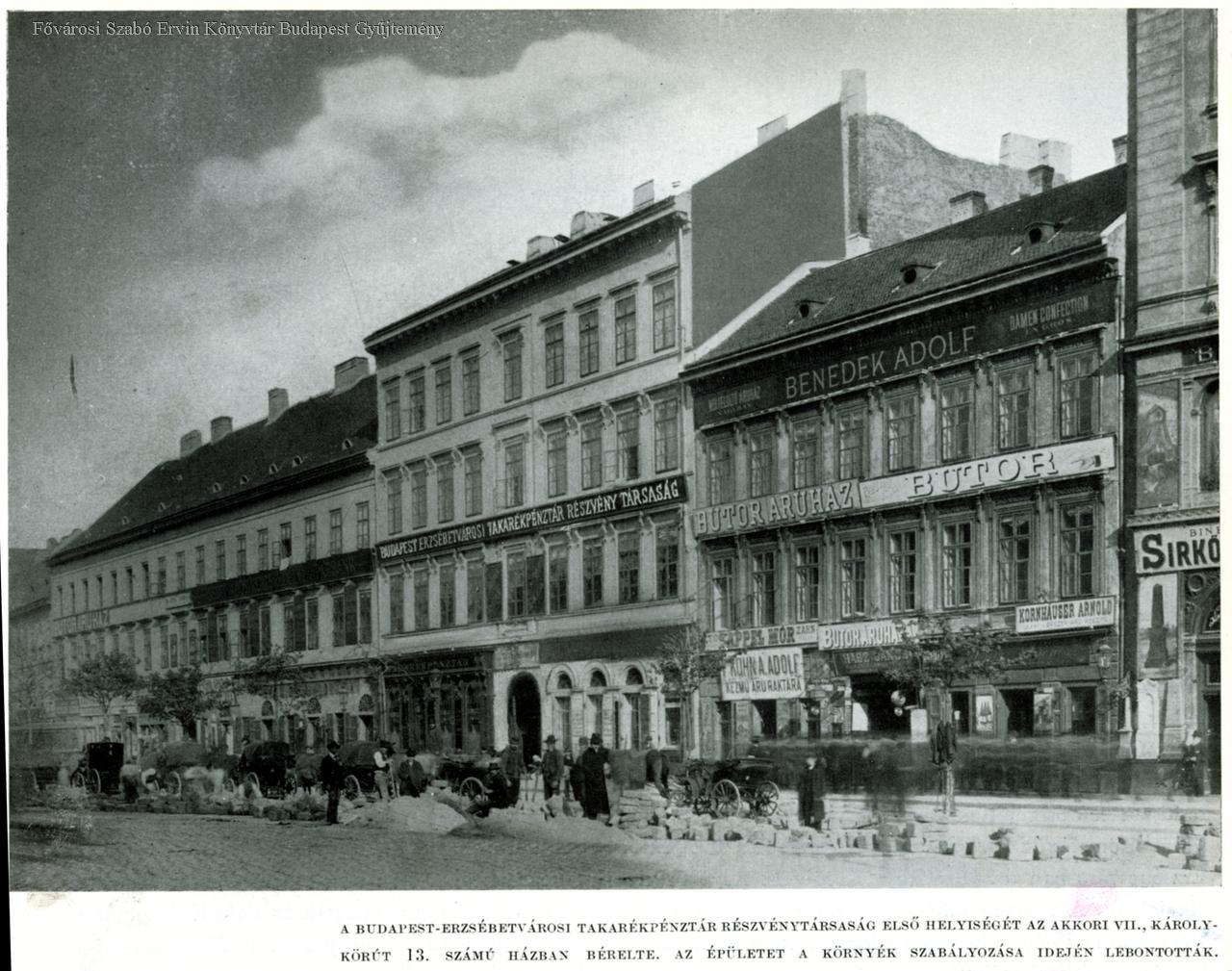 A Budapest-Erzsébetvárosi Takarékpénztár Részvénytársaság első helyiségét, az akkori VII. Károly körút 13. számú házban bérelte, az épületet a környék szabályozása idején lebontották