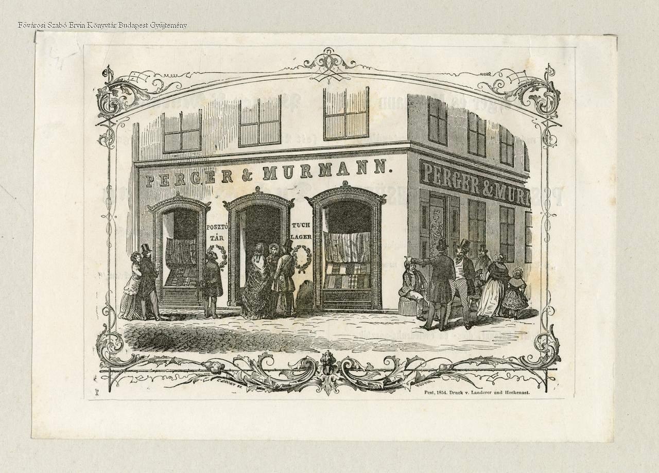 [Perger és Murmann "Borostyánkoszorúhoz" címzett posztókereskedése a Kishíd (Türr István) és Aranykéz utca sarkán]