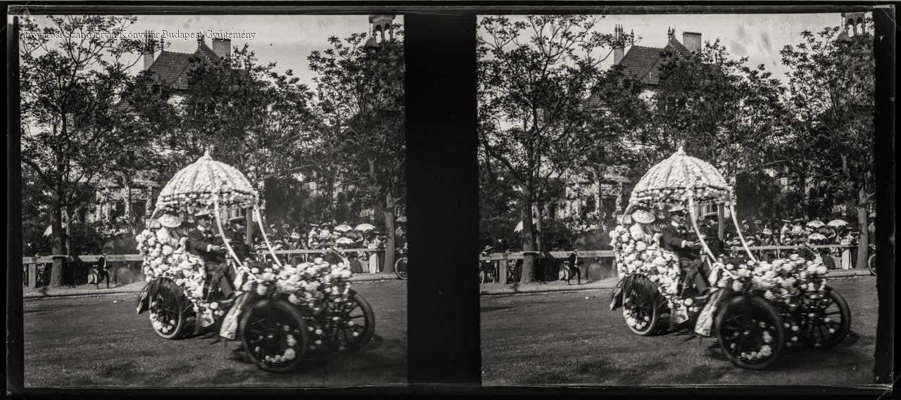 [Virágkorzó a Stefánia úton, Karátsonyi Jenő automobilja] [Floral corso on Stefánia Road, Jenő Karátsonyi's car]