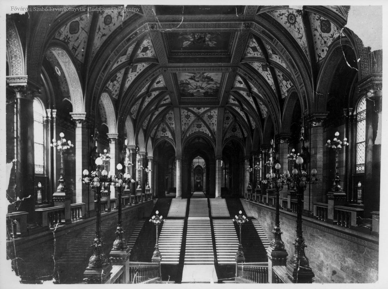 lépcsőház, országház, lámpa, falfestmény, díszítés, címer, historizmus, épületkép, belső felvétel, 1904 körül