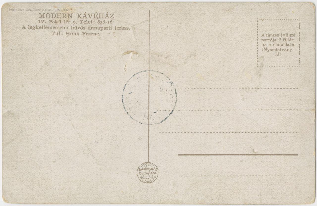 A képeslap hátoldalán: Modern Kávéház - A legkellemesebb hüvős dunaparti terass. IV. Eskü tér 9. Tul: Hahn Ferenc