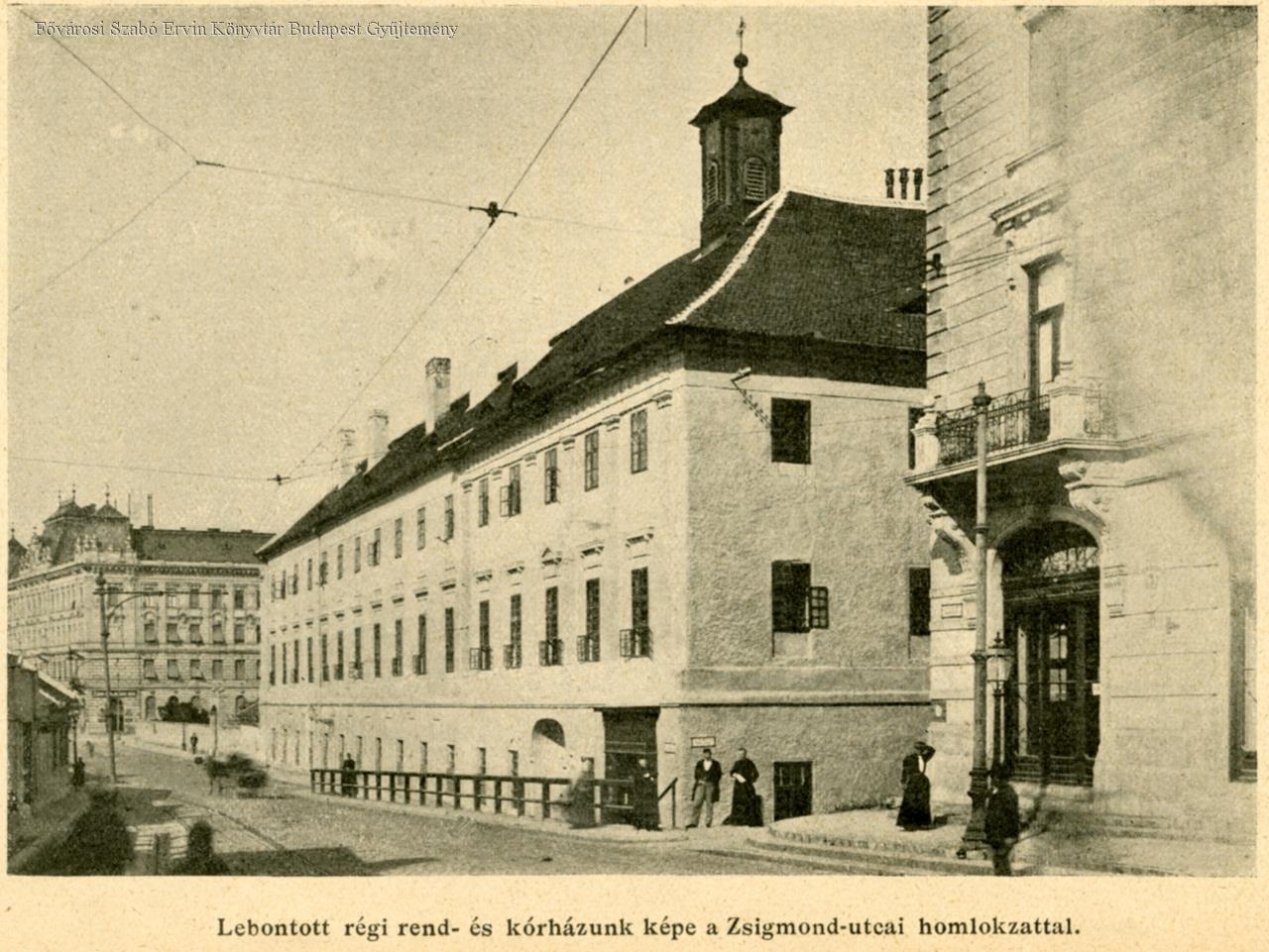 Lebontott régi rend- és kórházunk képe a Zsigmond utcai homlokzattal