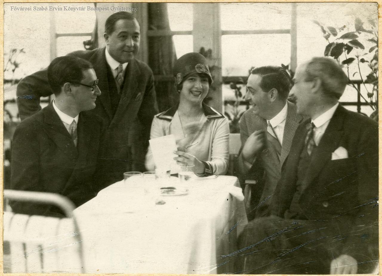 társaság, külföldi, olaszok, operaénekes, nő, szálloda, terasz, teázó, nevetés, csoportkép, belső felvétel, sajtófotó, 1930 körül