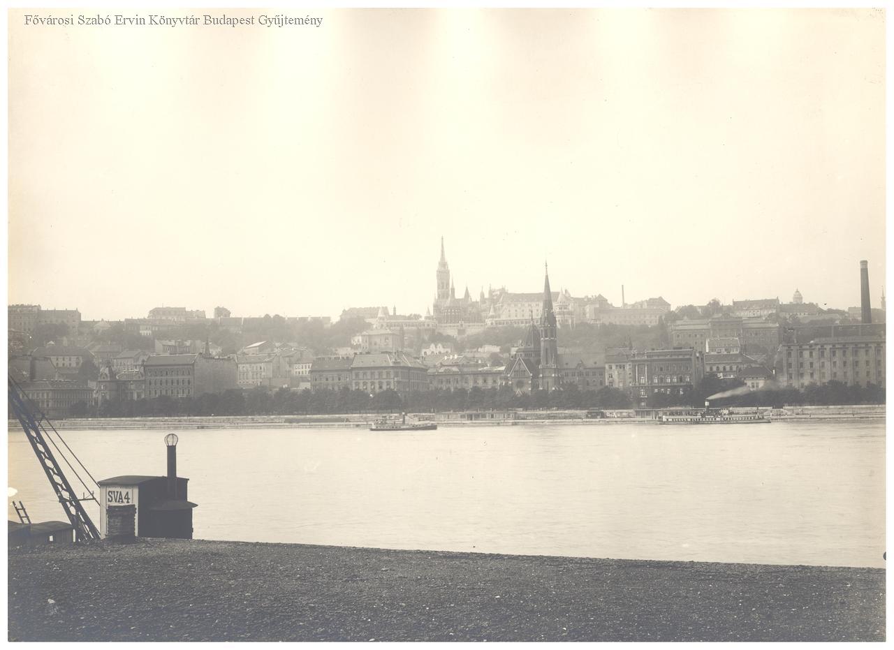 A Várhegy északi része Pestről. Rakparti lakóépületek. A kép jobb szélén a Blum-malom