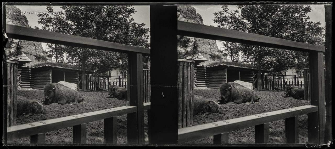 [Állatkert, bölények a bölényház előtt] [Budapest Zoo, bisons in front of the bison house]