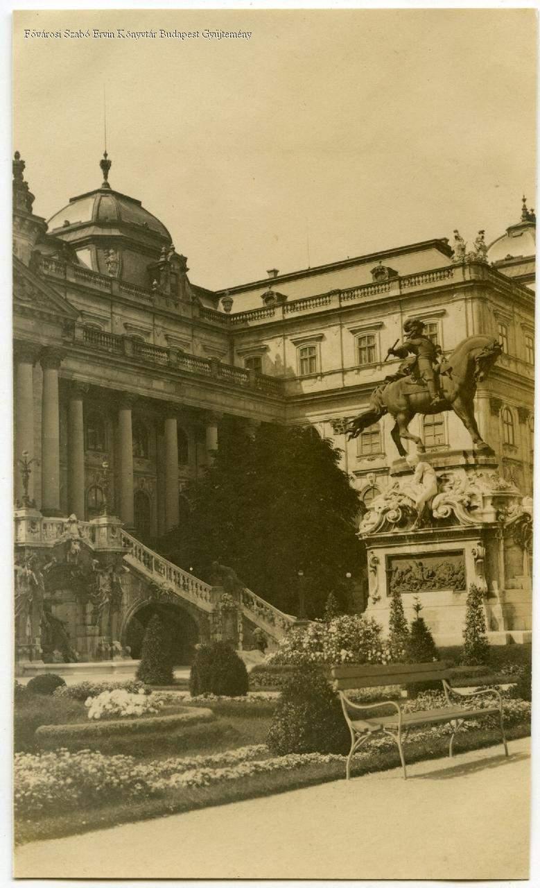 [Várkert (a mai Savoyai-terasz) részlete, jobbra Savoyai Jenő lovasszobra, középen balra a Habsburg lépcső]