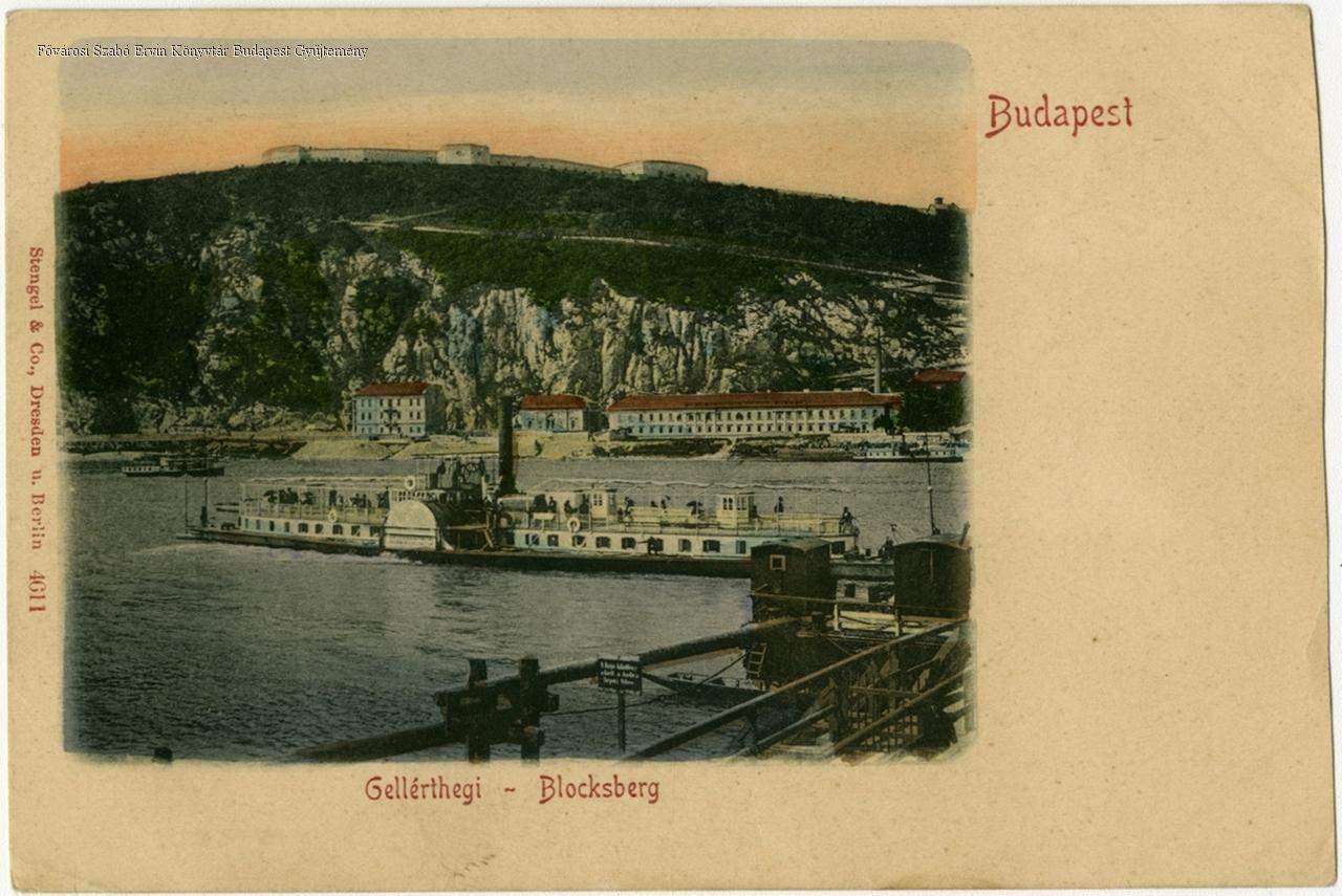 Gellérthegy a Citadellával az Eskü tér (ma Március 15.) felől, szemben a Rudas fürdő, a Dunán gőzhajó