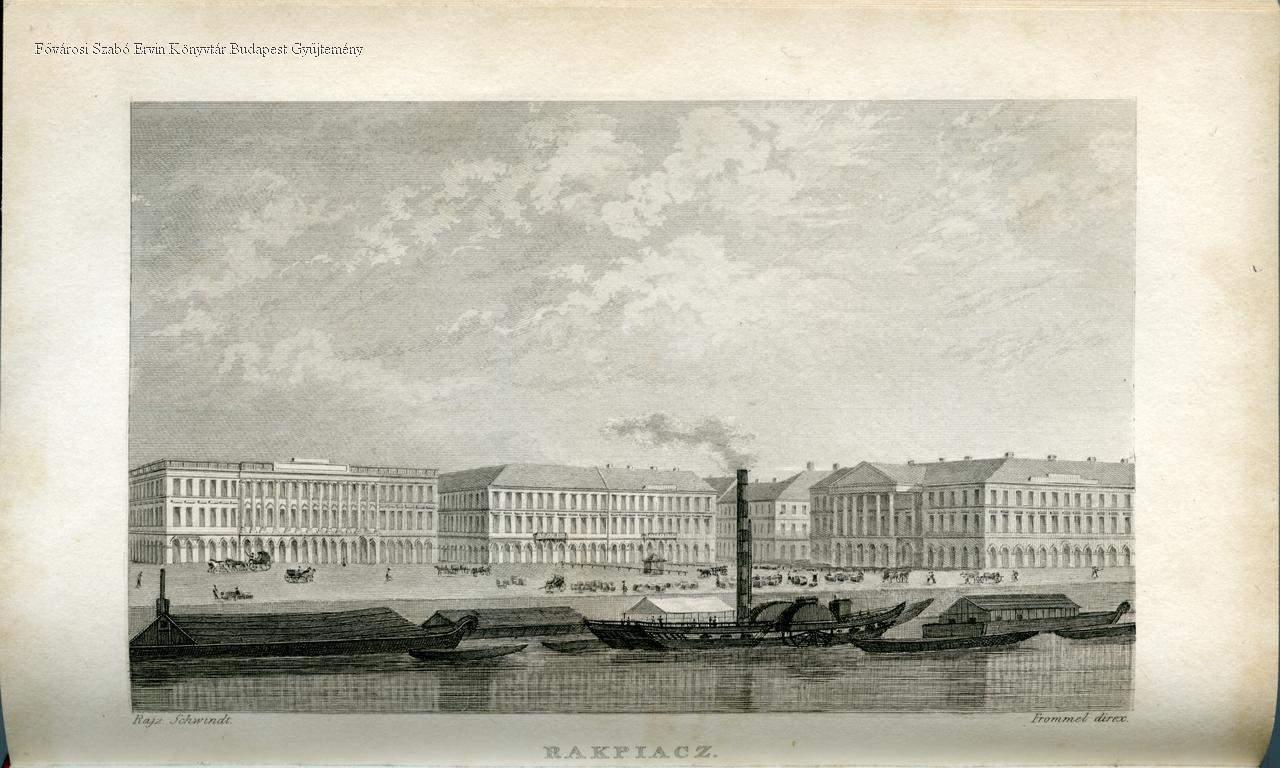városkép, utcakép, palota, lakóépület, fürdő, piac, rakpart, kikötő, uszály, gőzhajó, 1834