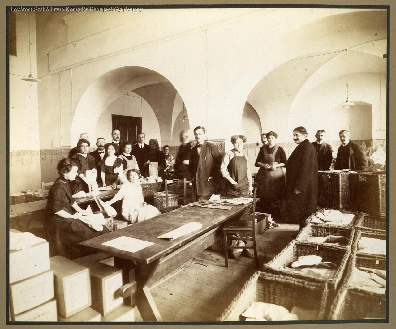 A szerkesztőség tagjai megtekintik az adományokat. Nők asztaloknál csomagolnak és rendszereznek, előtérben fonott ládák.