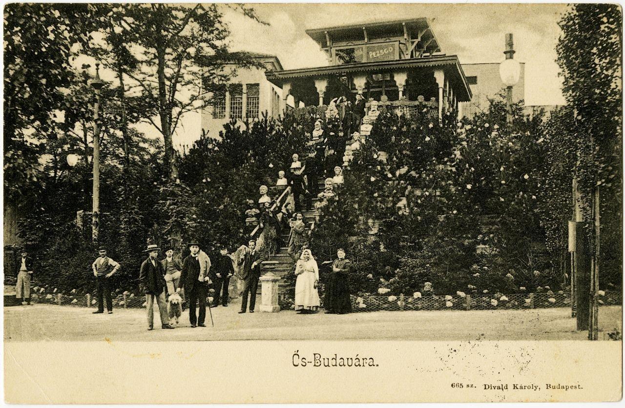 vendéglátás, pavilon, szórakozóhely, pezsgő, terasz, lépcső, növény, mellszobor, kiállítás, turizmus, csoportkép, külső felvétel, képes levelezőlap, 1890-as évek, 1900-as évek