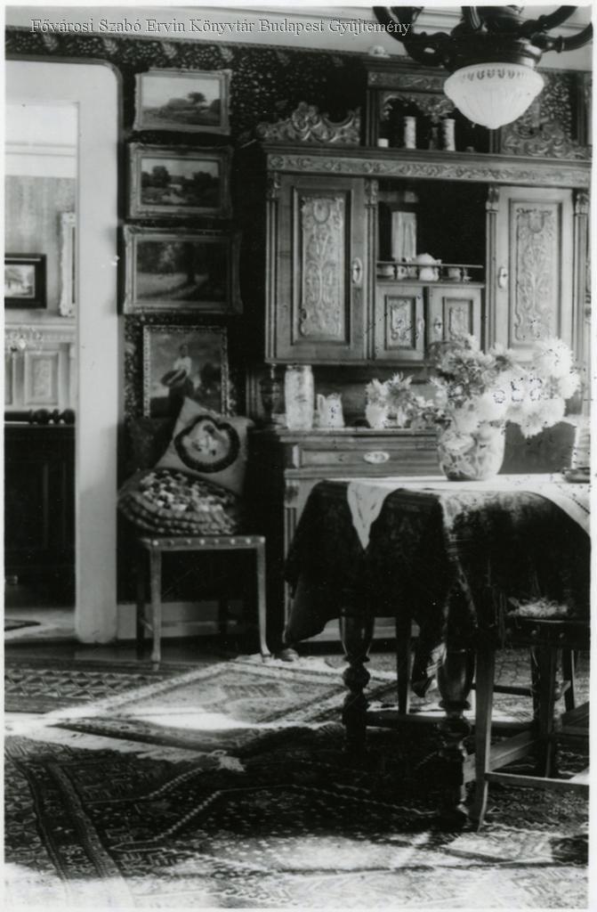belső felvétel, lakóhelyiség, lakberendezés, polgárság, asztal, támlásszék, szekrény, lámpa, virág, festmény, terítő, szőnyeg, 1930-as évek