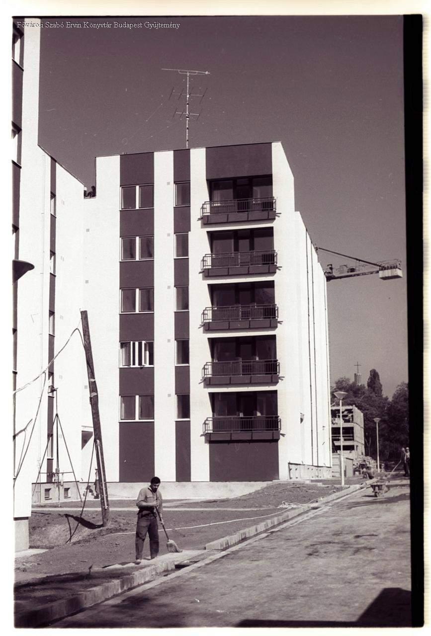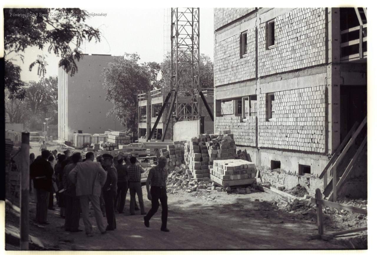 külső felvétel, épületkép, lakóépület, utcakép, ember, építés, állvány, daru, 1980-as évek