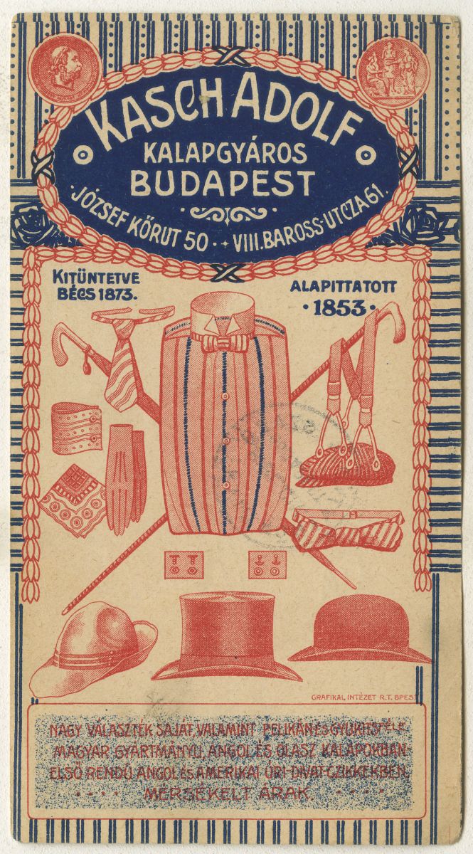A hirdetés szövege: Kasch Adolf kalapgyáros Budapest. József körút 50. VIII. Baross utca 61. Kitűntetve Bécs 1873. Alapíttatott 1853. Nagy választék saját, valamint Pelikán és Gyukits féle magyar gyártmány angol és olasz kalapokban első rendű angol és amerikai úri divat cikkekben mérsékelt árak.
