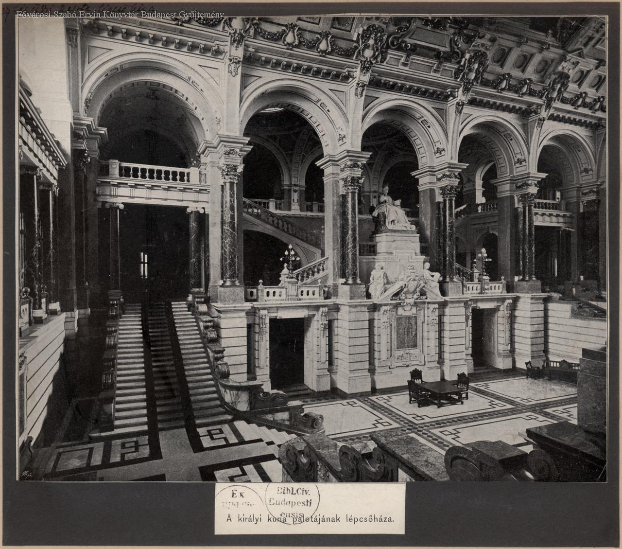 bíróság, neoreneszánsz, előcsarnok, lépcsőház, díszítés, szobor, épületkép, belső felvétel, 1896 után