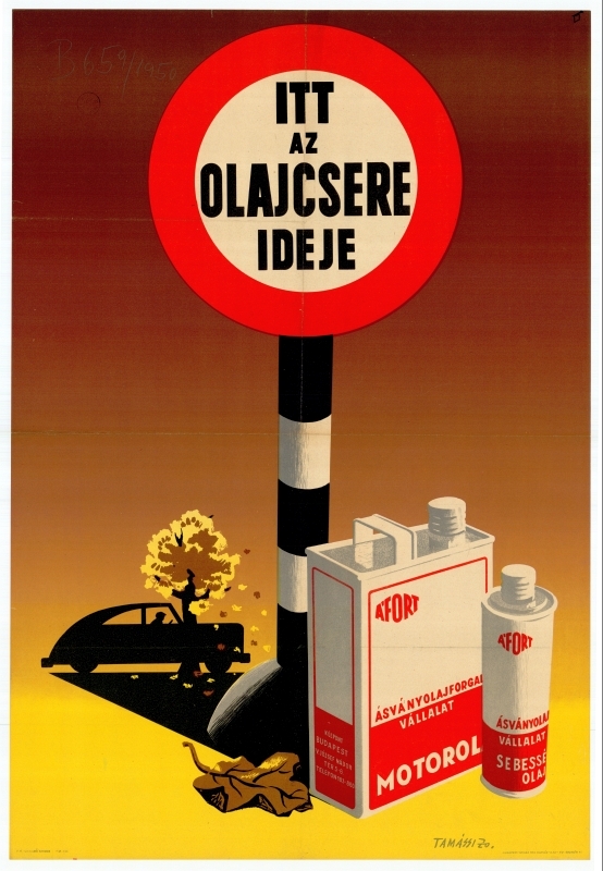 grafikus plakát, reklám, motorolaj, benzin, hirdetés, Ásványolajforgalmi Rt., államosítás