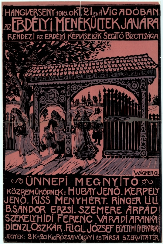 Az Erdélyi Képviselők Segítő Bizottságának plakátja az 1916. október 21-i koncertről, amelyet az erdélyi menekültek javára tartottak a Vigadóban. Közreműködők: Hubay Jenő, Kerpely Jenő, Kiss Menyhért, Ringer Lili, B. Sándor Erzsi, Szemere Árpád, Székelyhidi Ferenc, Váradi Aranka, Dienzl Oszkár, Fligl József, egyetemi énekkarok