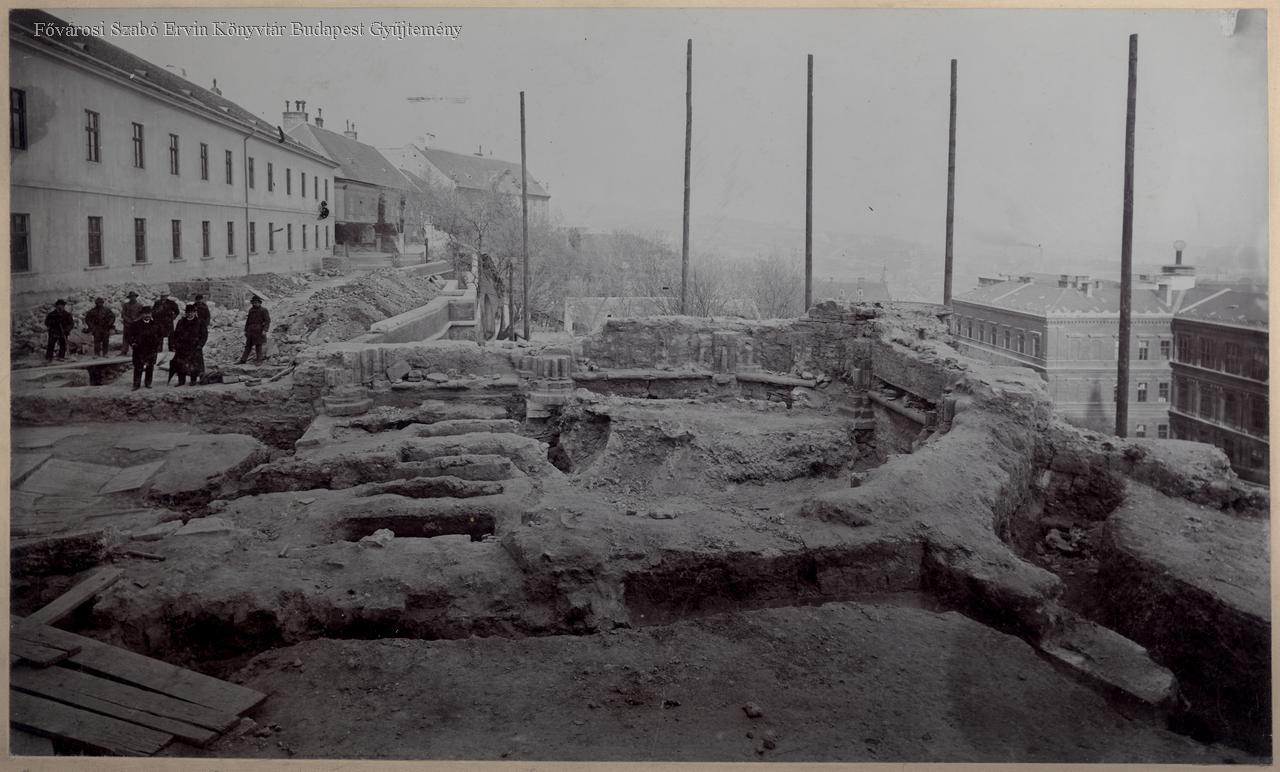 XIII. századi templom szentélyének feltárt romjai a várfal mentén, a mai Hilton Szálló helyén. Kiásott földkupacok. Munkások, ellenőrök. Kilátás a várhegy oldalában álló vizivárosi házakra