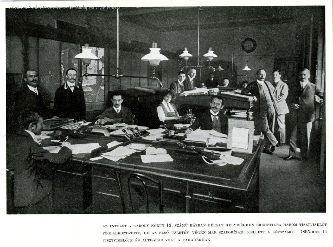 [A Budapest-Erzsébetvárosi Takarékpénztár alkalmazottai az intézet Károly-körút 13. sz. házban bérelt helyiségben]