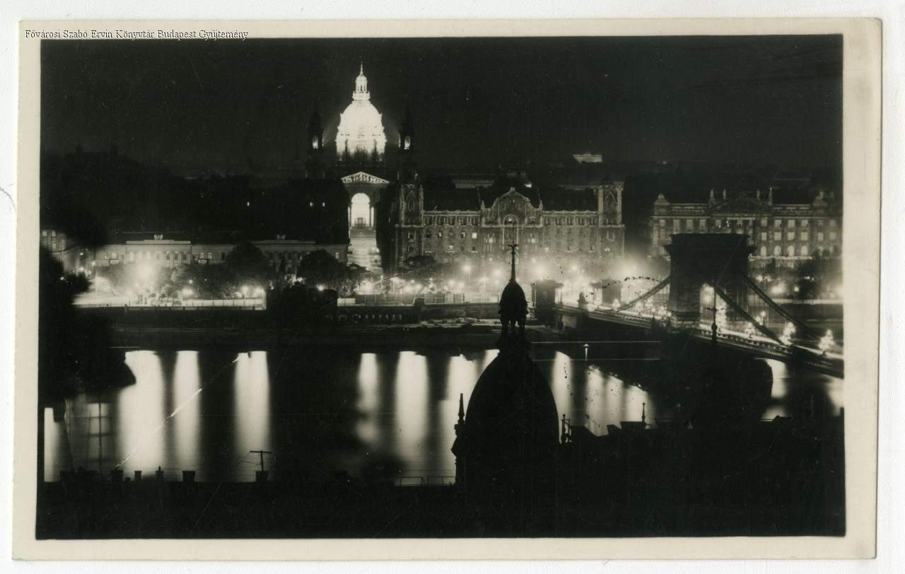 lakóépület, palota, bazilika, katolikus egyház, híd, rakpart, éjjel, este, kivilágítás, közvilágítás, képes levelezőlap, külső felvétel, látkép, 1930-as évek