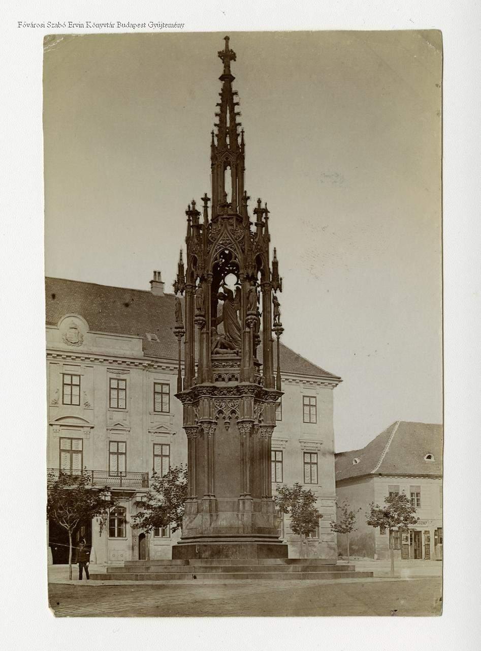 [A Hentzi-emlékmű, mögötte a volt Teleki-, később József főhercegi palota átépítés előtti állapotában]