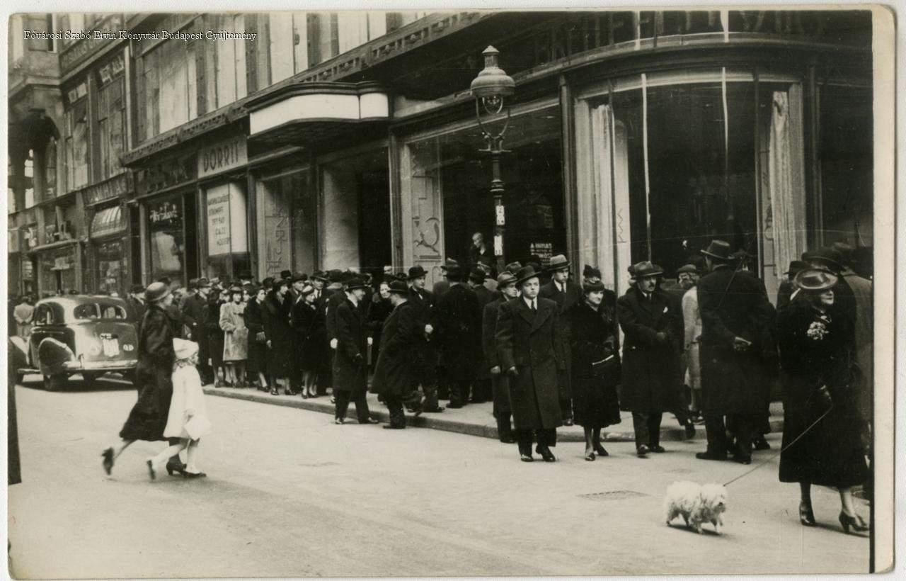 [Tömeg Breitfeld M. Marcell Váci utcai szőrmeüzlete előtt]