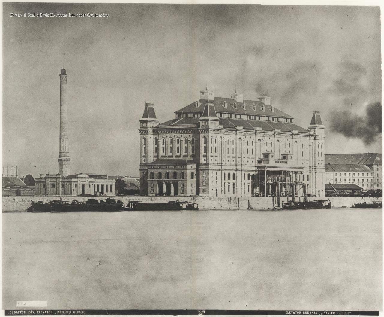 raktár, épület, raktározás, gabonatárolás, vízi szállítás, vasúti szállítás, élelmiszeripar, élelmiszer-kereskedelem, uszály, kazánház, épületkép, látkép, 1883, századvég