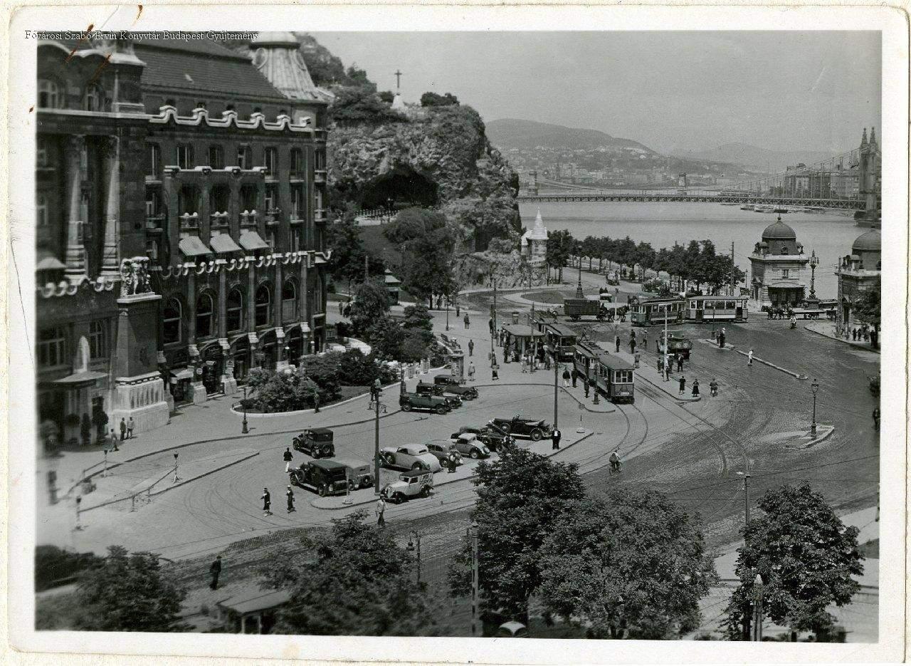 külső felvétel, utcakép, gépkocsi, villamos kocsi, villamosmegálló, járdasziget, közlekedés, szekér, sín, fa, szálloda, kápolna