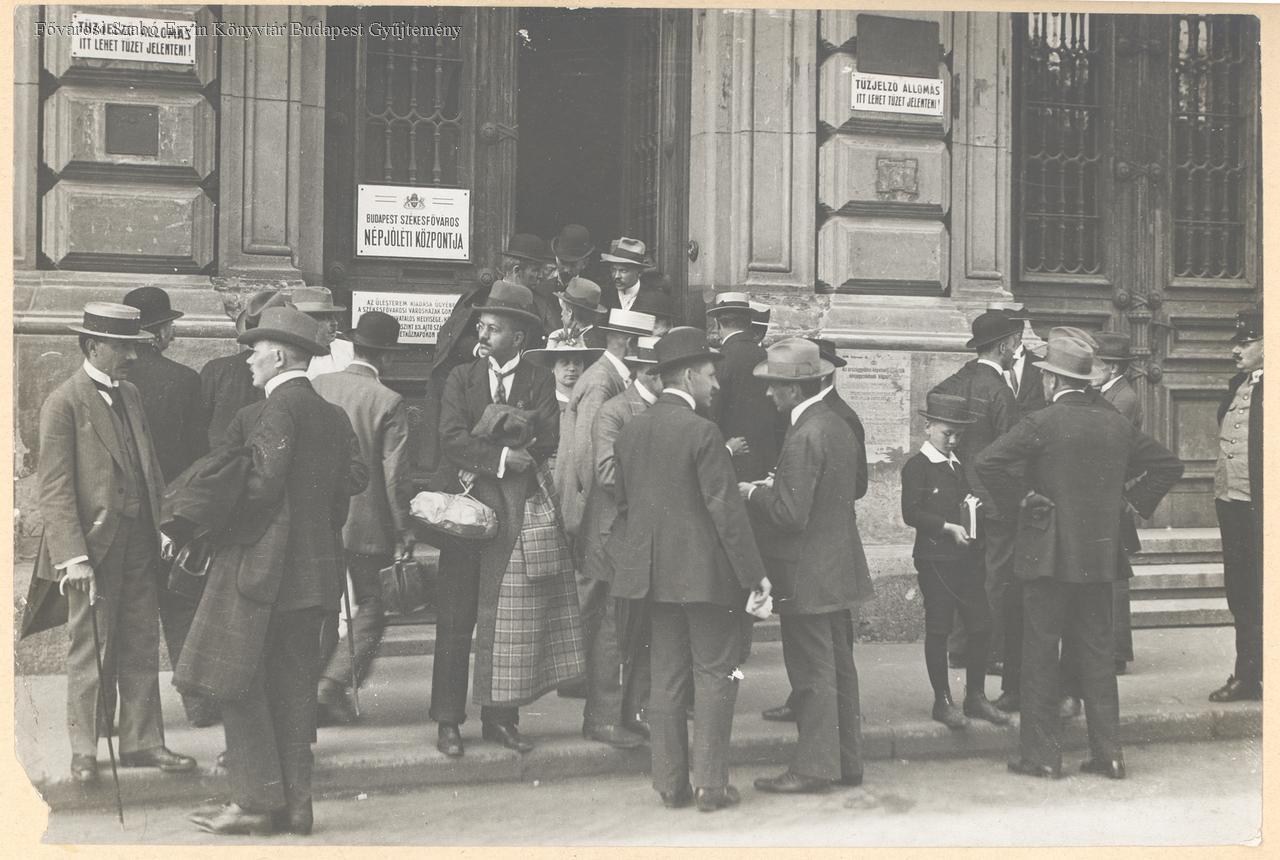 Csoportosulás a Székesfővárosi Népjóléti Központ előtt 1918-ban az Újvárosháza épülete előtt