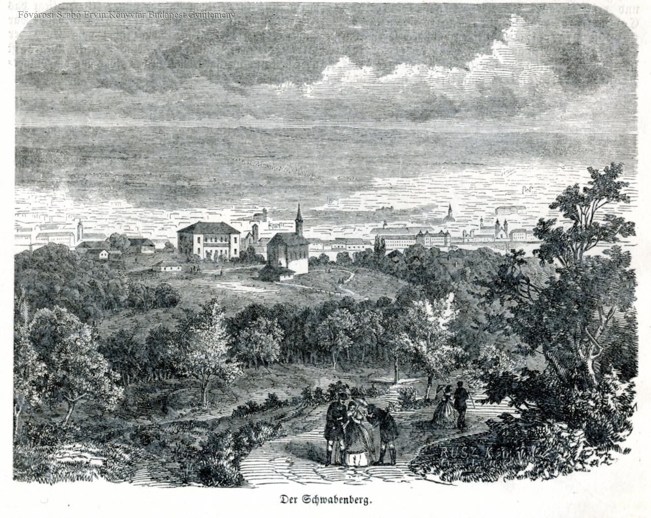 Tájképrészlet háttérben a város látképével, kápolna. Előtérben alakok: egy napernyős hölgy két férfi társaságában