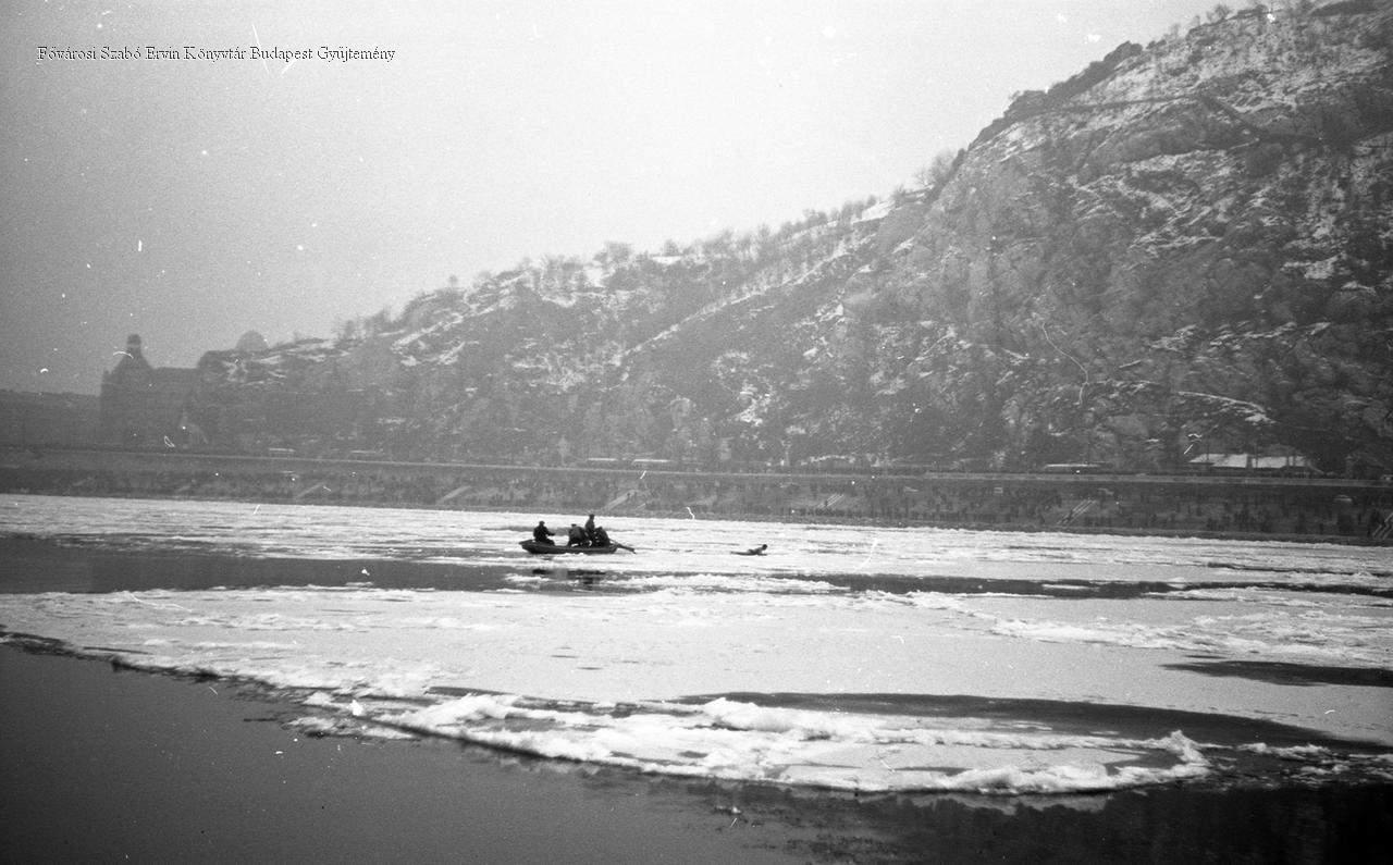 [Schirilla György a jeges Dunában, az Erzsébet híd közelében]