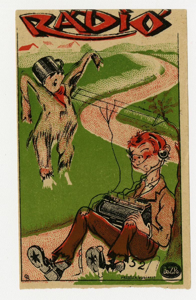 rádióhallgatás, rádió, rádiókészülék, fejhallgató, férfi, madárijesztő, reklámnyomtatvány, kisnyomtatvány, aprónyomtatvány, számolócédula