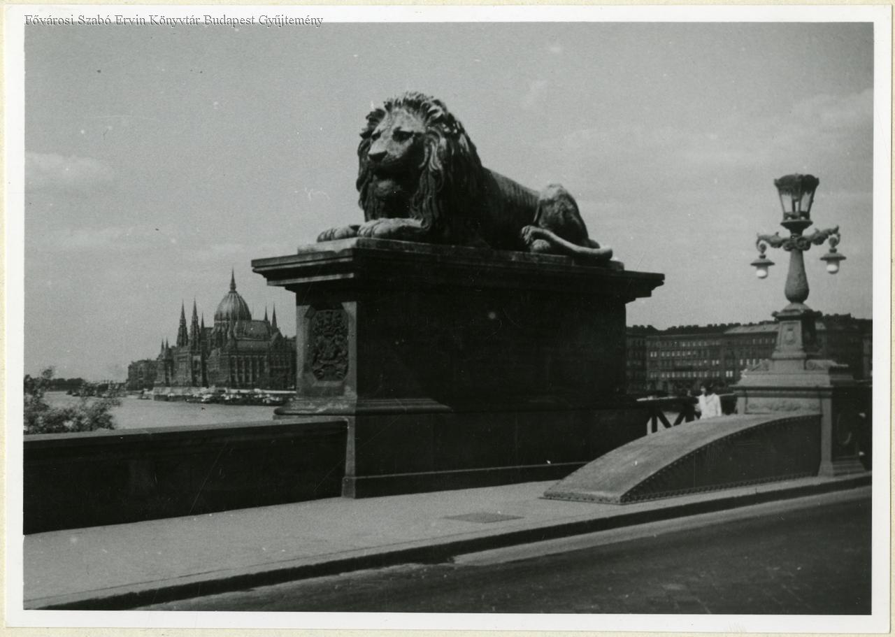 közúti híd, szobor, állatkép, oroszlán, közvilágítás, lámpa, gyalogos közlekedés, 1940-es évek