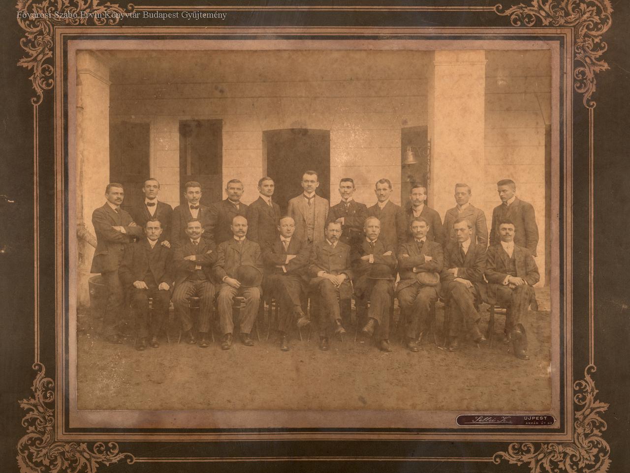 Valószínűleg egy cég/üzem alkalmazottainak csoportja nagyobb épület előtt: Thonet-székeken ülve és azok mögött állva. Kolomp. Esővizes dézsa